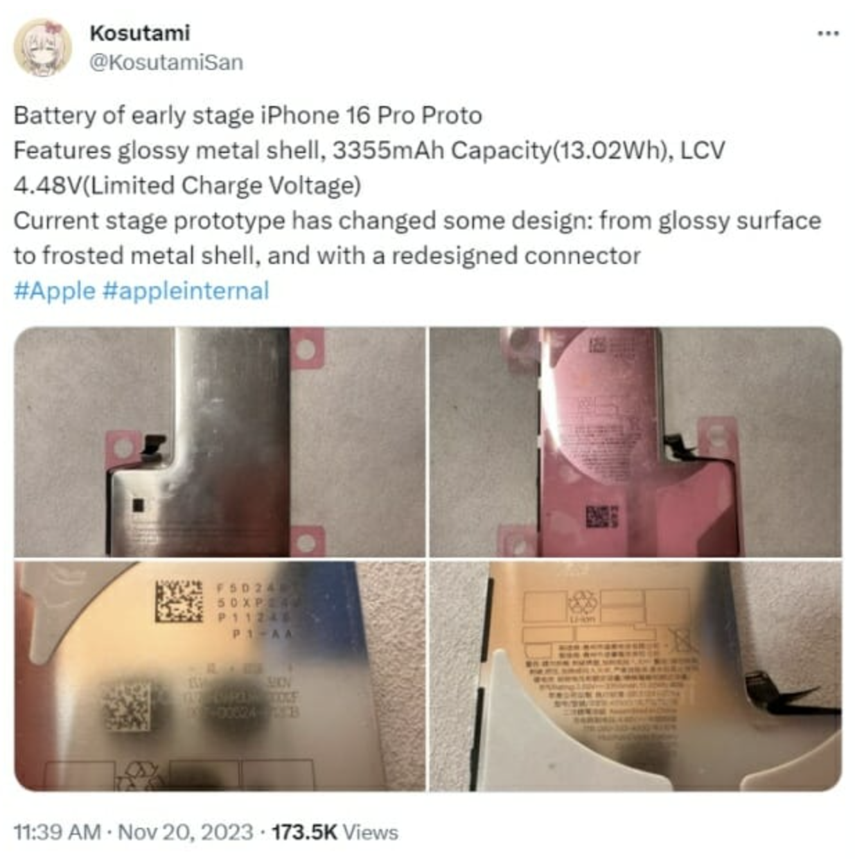 2024년에 출시에 관련하여 일부모델이 적용될 아이폰16 프로 배터리 사진이 공개되었습니다. IT 팁스터 코스타미의 게시물을 토대로 공개했습니다.
